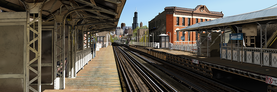 | This was, at the time, the most ambitious digital painting I had ever done. It was unveiled at Photoshop World in Miami on March 22, 2006. It is a panorama of the Damen Station on the Blue Line of the Chicago Transit Authority Adobe Illustrator was used for generating the majority of the basic shapes as well as all the buildings in the Chicago skyline. • The image size is 40 inches by 120 inches. • The flattened file weighs in at 1.7 Gigabytes. • It took eleven months (close to 2,000 hours) to create. • The painting is comprised of close to fifty individual Photoshop files. • Taking a cumulative total of all the files, the overall image contains over 15,000 layers. • Over 500 alpha channels were used for various effects. • Over 250,000 paths make up the multitude of shapes throughout the scene. |