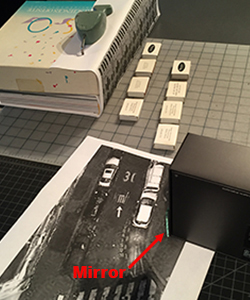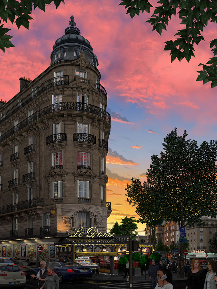 Le Dome (2017) Le Dome is a seafood restaurant that graces a corner of Montparnasse Boulevard. My wife, Zosia and I were staying at a cute little Airbnb a couple of blocks away. Montparnasse is a beautiful boulevard amidst the hundreds of beautiful boulevards that make up the city of Paris. Sifting through the thousands of shots from the trip, the shot in Figure 1, (top left) jumped out at me as the subject for an image of Paris. The feeling would be my inspiration -- the memories. At the time I took the shot, painting it was not a thought. My shot shows little detail. Google Street View allowed me to revisit the spot and get a fairly good amount of the reference needed. Others required a bit more work. Figure 2, (top right) shows the angled side of the entrance to the restaurant. Google Street View let me see that the side is made of glass and mirrors with a central area with some posters in it. This was all I needed to know. However, there have to be reflections. My shot had no detail. The Google Street View cameras are mounted on cars above eye level. What I saw reflected was the sidewalk. Figure 3, (middle left) shows how I solved the problem. To get the proper reflections I printed an aerial view of the corner. I then printed a recurring building taken from my painting Venetian night and affixed it to some books and placed it over the aerial view along the street side. A small mirror was taped against another box and placed over the angled wall in the aerial view. A few match boxes stood in for cars. I placed my camera on the table over where I stood in the aerial view as seen in Figure 4, (middle right). I then calculated how far down the street you would see. I went to that spot in Google Street View seen in Figure 5, (bottom left) and I was able to create the proper reflection as shown in Figure 6, (bottom right).